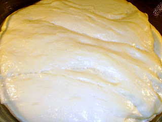 Pour the dough in a large bowl greased with about 1 tablespoon olive oil and turn it over few times to lightly coat all sides . Cover bowl with plastic wrap or a cotton cloth and leave to rise for about 30 minutes or until almost doubled in bulk.