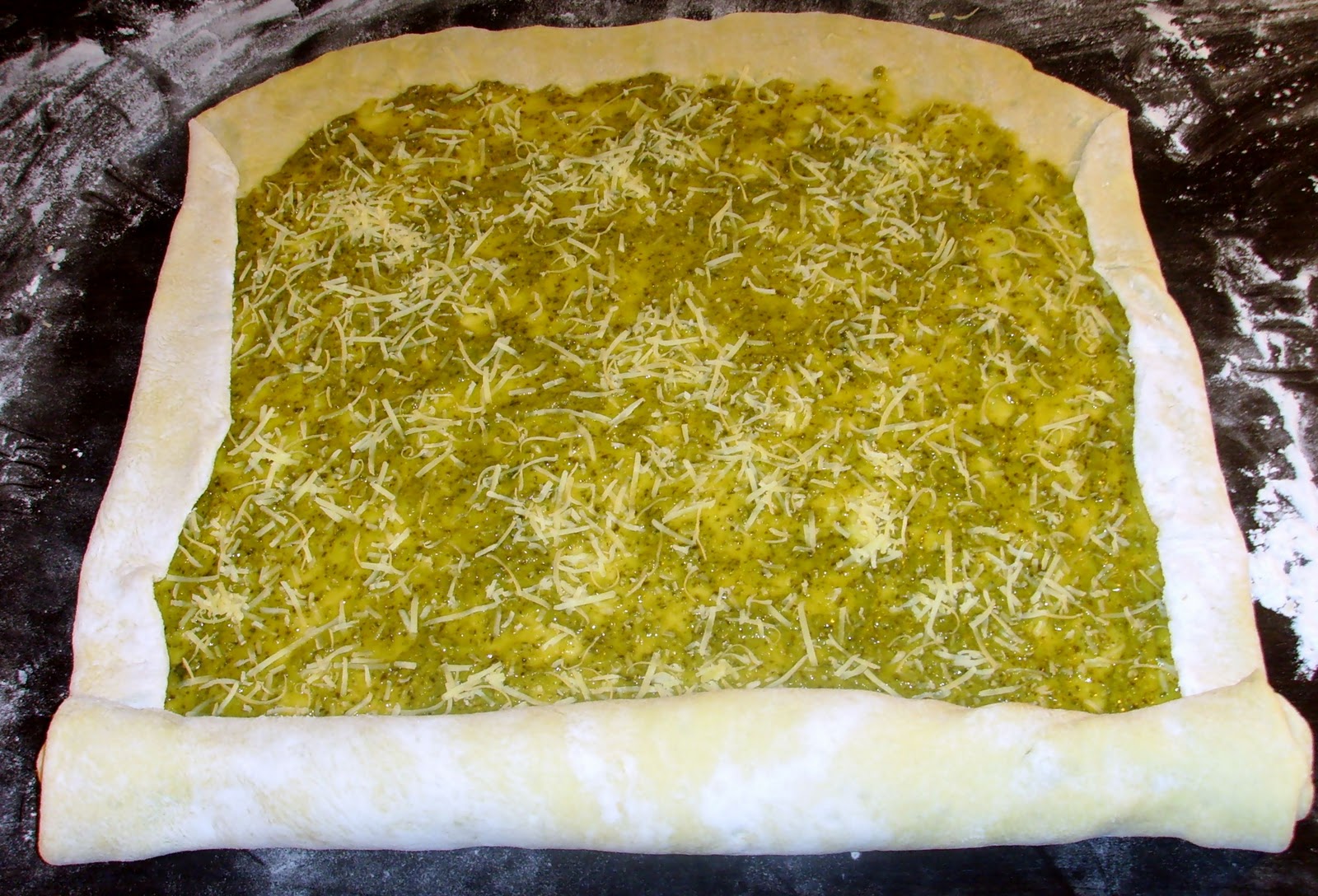 Намазваме кората с половината от Пестото, като оставяме около 2-3 см по краищата непокрити.