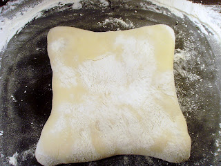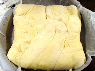 Разточваме правоъгълна кора – с дебелина около 2 см (моята се получи с размери приблизително 40х40 см)