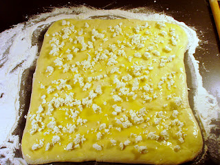 Отново обръщаме кората (прегъната страна да остане отдолу), разточваме до първоначалните размери на кората, намазваме с последната част от маслото и поръсваме с последната част от сиренето.