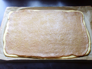 Разточваме тестото с точилка на кора с размери около 60 на 40 см. и дебелина около 0.5 см.