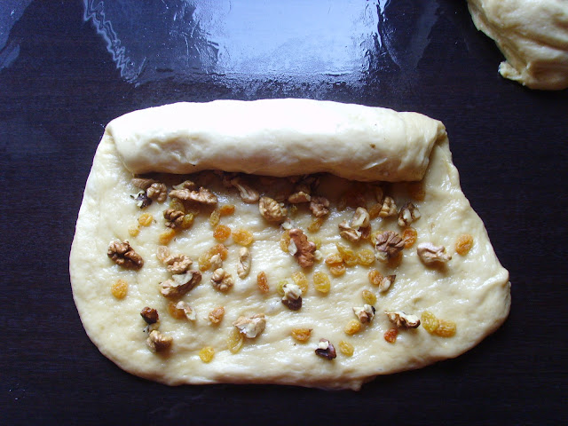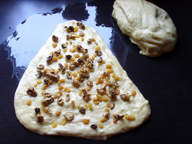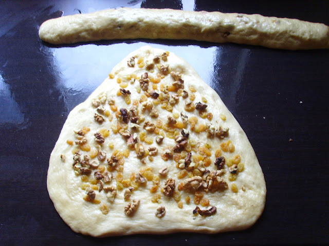 Оформяме с ръце нещо като триъгълник от половината тесто и поръсваме с орехи и стафиди.