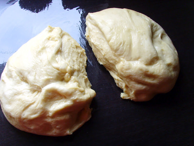 Изсипваме втасалото тесто върху намаслен работен плот и разделяме на две.