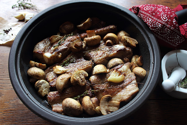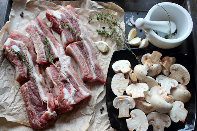 Ingredients: 600 g pork ribs with bone 200g mushrooms 3 cloves garlic 2-3 sprigs fresh thyme, or 1-2 pinches dried thyme salt and pepper to taste 2-3 tablespoons olive oil 50-60 g butter, diced 2-3 tablespoons soy sauce, optional