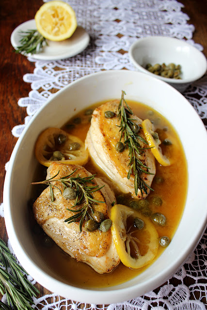 Method: Pre-heat oven to 180C or 160C with a fan. Wash chicken breasts and dry over kitchen paper. Sprinkle evenly all over with salt and pepper to taste. In a heavy bottom pan with removable handle (or other suitable baking pan) heat the olive oil on medium heat and place the chicken breasts, skin side down. Add the butter and rosemary and fry for a minute or two. Turn the breasts and fry for another minute or two. Add the martini, lemon juice, lemon slices (optional) and capers. Bake in preheated to 180C and 160C with a fan oven for 10 to 12 minutes. Serve over pasta or with fresh salad and sprinkle with the sauces from baking roght brfore serving.