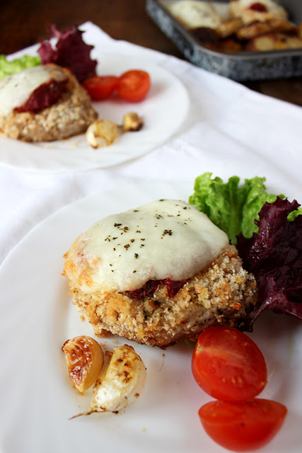 Ingredients: 4 boneless pork chops, cut into thin (about 1.5 cm) salt and pepper to taste 4 tablespoons tomato salsa (or tomato paste diluted with some tomato sauce ;) 4 slices mozzarella 2-3 tablespoons olive oil, plus a few more drops - for sprinkling 30 g butter 3-4 cloves garlic, skinned 1 slice dry bread, for the fresh crumbs 1-2 pinches of dried basil