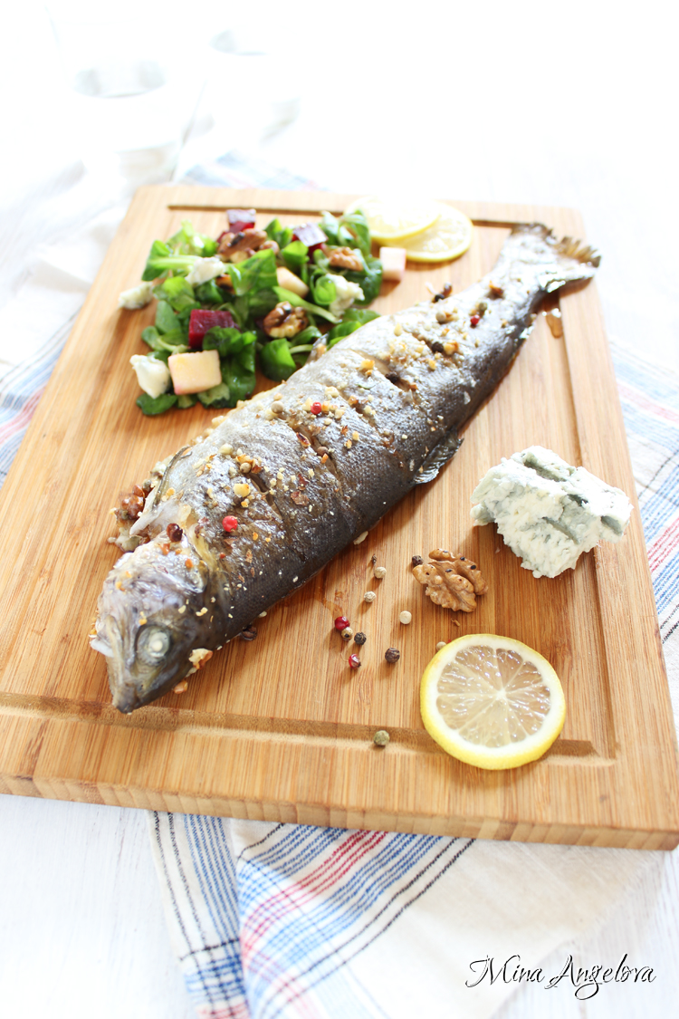 Поръсваме със зехтин, стръкчета или листа свежа мащерка и зърна пипер (без да солим - рибата ще си поеме от солта).