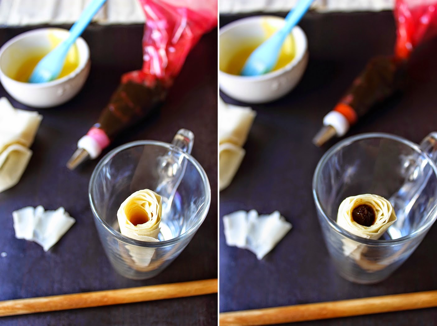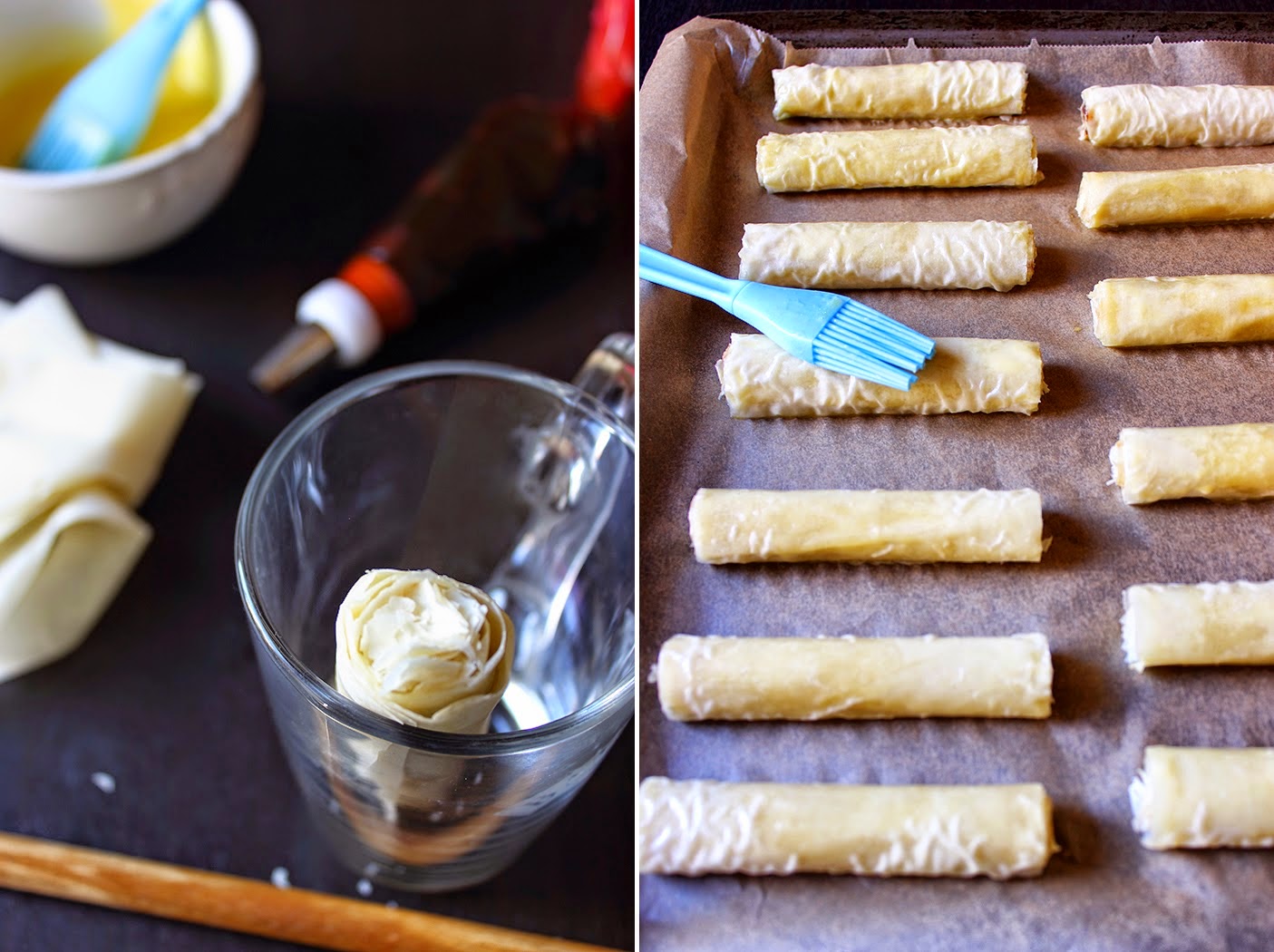 Разстелете последователно корите бутер тесто върху леко набрашнена работна повърхност и изрежете 2 еднакви кори бутер тесто, според размера на тавата.