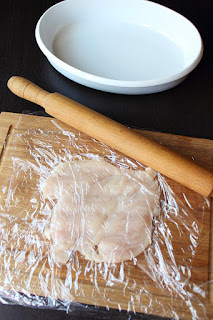През фолио върху кухненска дъска изтъняваме с точилка или с кухненско чукче и подправяме със сол и пипер на вкус.