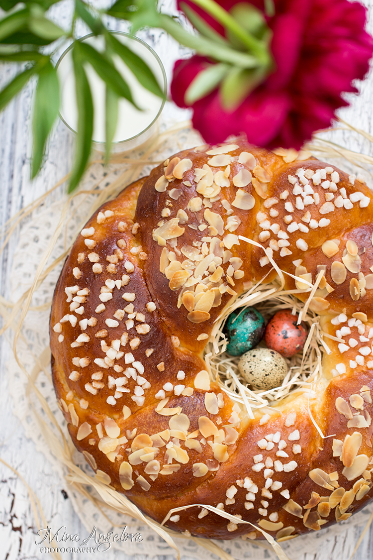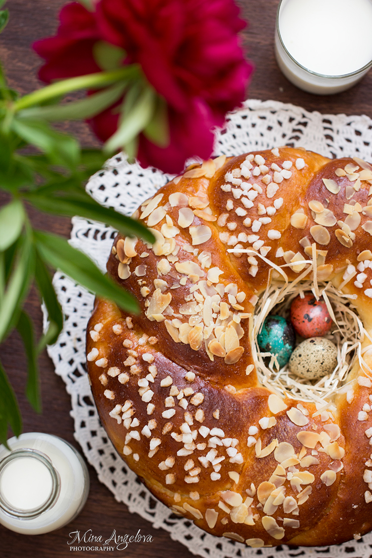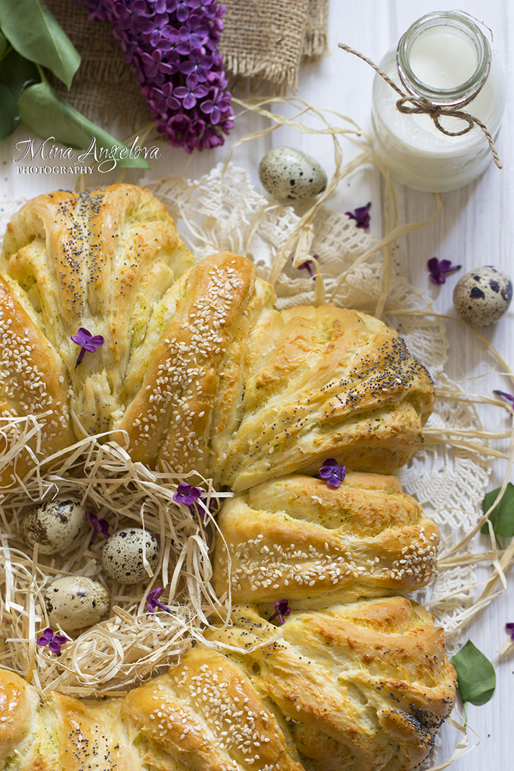 Намажете отгоре тестото равномерно с разбито яйце и печете 35-45 минути или докато забит до дъното тестер излиза сух и без полепнали трохи.
